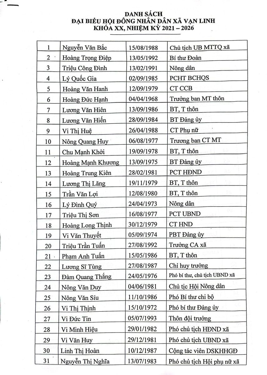 Sau khi thực hiện sáp nhập 3 xã Vạn Linh, Hòa Bình, Y Tịch thành xã Vạn Linh mới, danh sách đại biểu HĐND xã khóa XX, nhiệm kỳ 2021 – 2026 với 66 đại biểu được cử tri tín nhiệm bầu chọn từ đầu nhiệm kỳ. Đây là những đồng chí tiêu biểu, đại diện cho ý chí, nguyện vọng của nhân dân trên toàn xã.