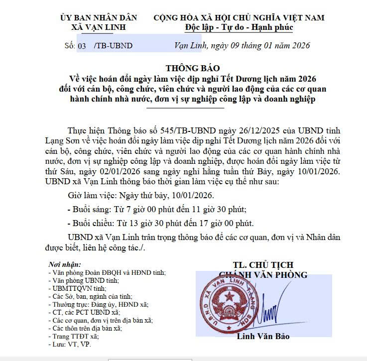 Thông báo: Về việc hoán đổi ngày làm việc dịp nghỉ Tết Dương lịch năm 2026 đối với cán bộ, công chức, viên chức và người lao động của các cơ quan hành chính nhà nước, đơn vị sự nghiệp công lập và doanh nghiệp