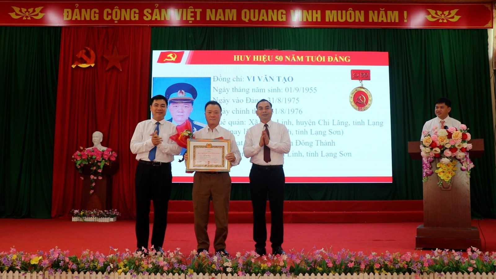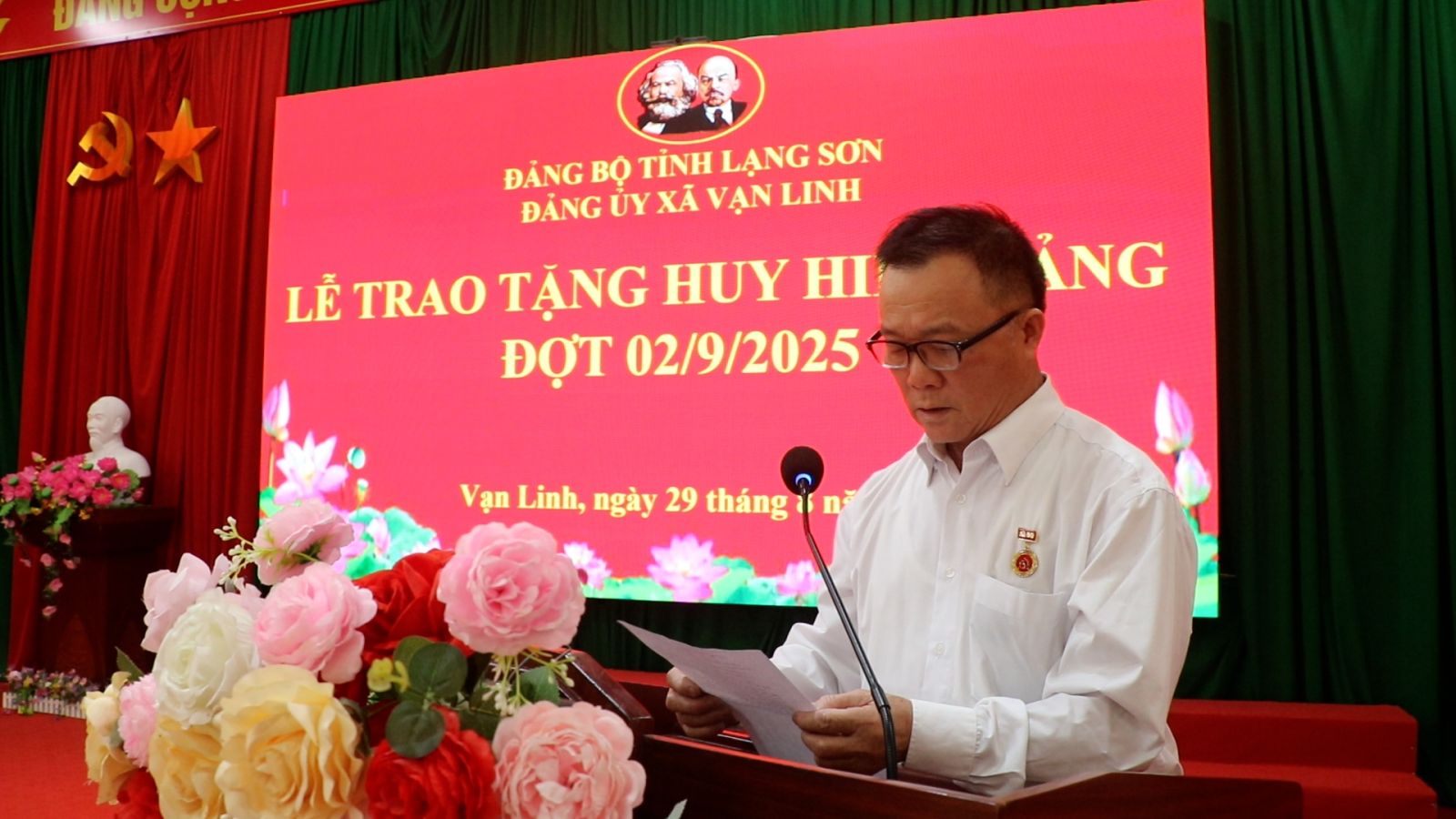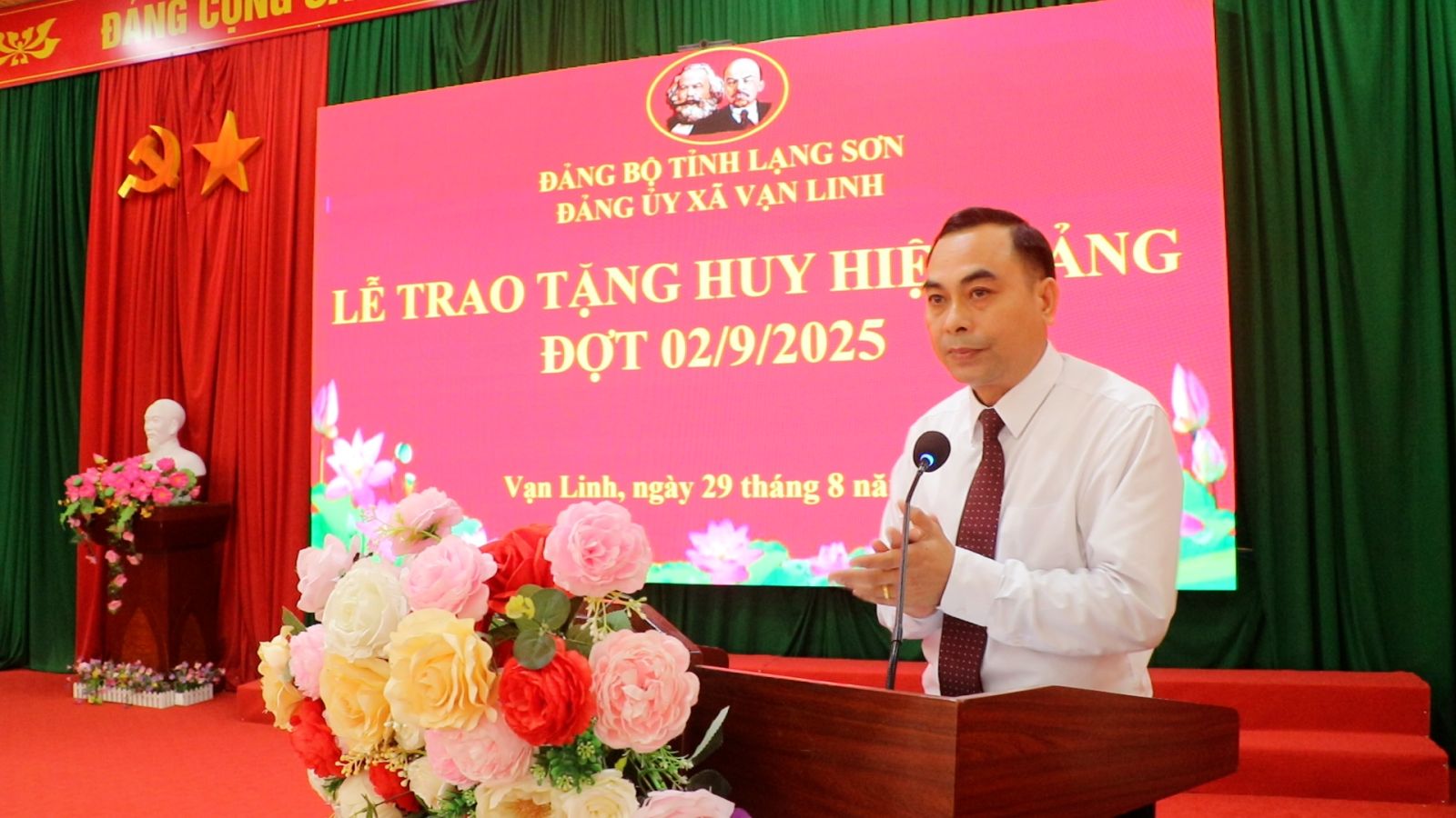Tại buổi lễ, lãnh đạo Ban xây dựng đảng xã Vạn Linh đã công bố Quyết định của Ban Thường vụ Tỉnh ủy Lạng Sơn về việc trao tặng Huy hiệu Đảng cho 7 đồng chí đảng viên, trong đó có đồng chí Vi Văn Tạo – đảng viên Chi bộ thôn Đông Thành, vinh dự được nhận Huy hiệu 50 năm tuổi Đảng; các đồng chí Hoàng Văn Lê, Phạm Văn Hoạt nhận Huy hiệu 40 năm tuổi Đảng; các đồng chí Vi Văn Lận, Hứa Thị Sín, Lâm Văn Tiến nhận Huy hiệu 30 năm tuổi Đảng; và truy tặng Huy hiệu 55 năm tuổi Đảng cho đồng chí Thi Văn Lịch. Đại diện đảng viên được nhận Huy hiệu, đồng chí Vi Văn Tạo xúc động phát biểu: Đây không chỉ là sự ghi nhận những nỗ lực, cống hiến của tôi trong suốt thời gian qua, mà còn là động lực để tôi tiếp tục phấn đấu, rèn luyện và cống hiến nhiều hơn nữa cho Đảng và nhân dân. Nhận Huy hiệu Đảng hôm nay, tôi càng nhận thức rõ hơn trách nhiệm của mình, xin hứa sẽ tiếp tục học tập, làm theo tư tưởng, đạo đức, phong cách Hồ Chí Minh, giữ vững phẩm chất đạo đức cách mạng, hoàn thành xuất sắc nhiệm vụ được giao, góp phần xây dựng Đảng ngày càng vững mạnh.